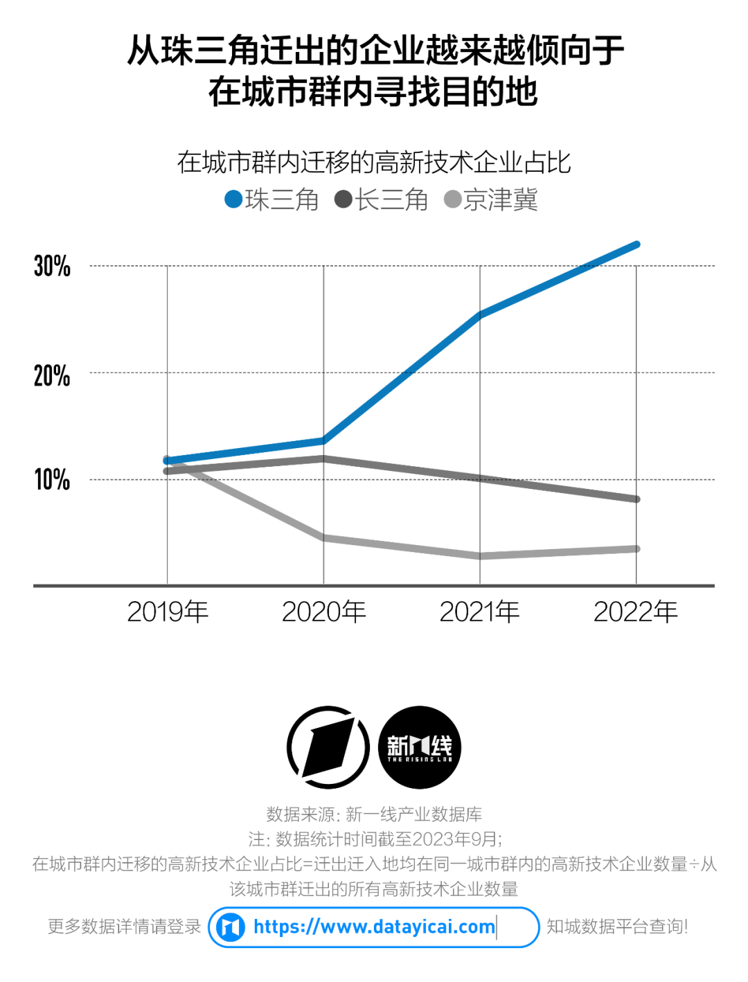 2022年,從珠三角城市離開的高新技術(shù)企業(yè)中,有31.94%直接就近遷入了城市群內(nèi)的其他城市。相比之下,長三角、京津冀未能將遷出企業(yè)留在城市群內(nèi)部,且集中表現(xiàn)出從一線城市向低線城市單向流動的特征。